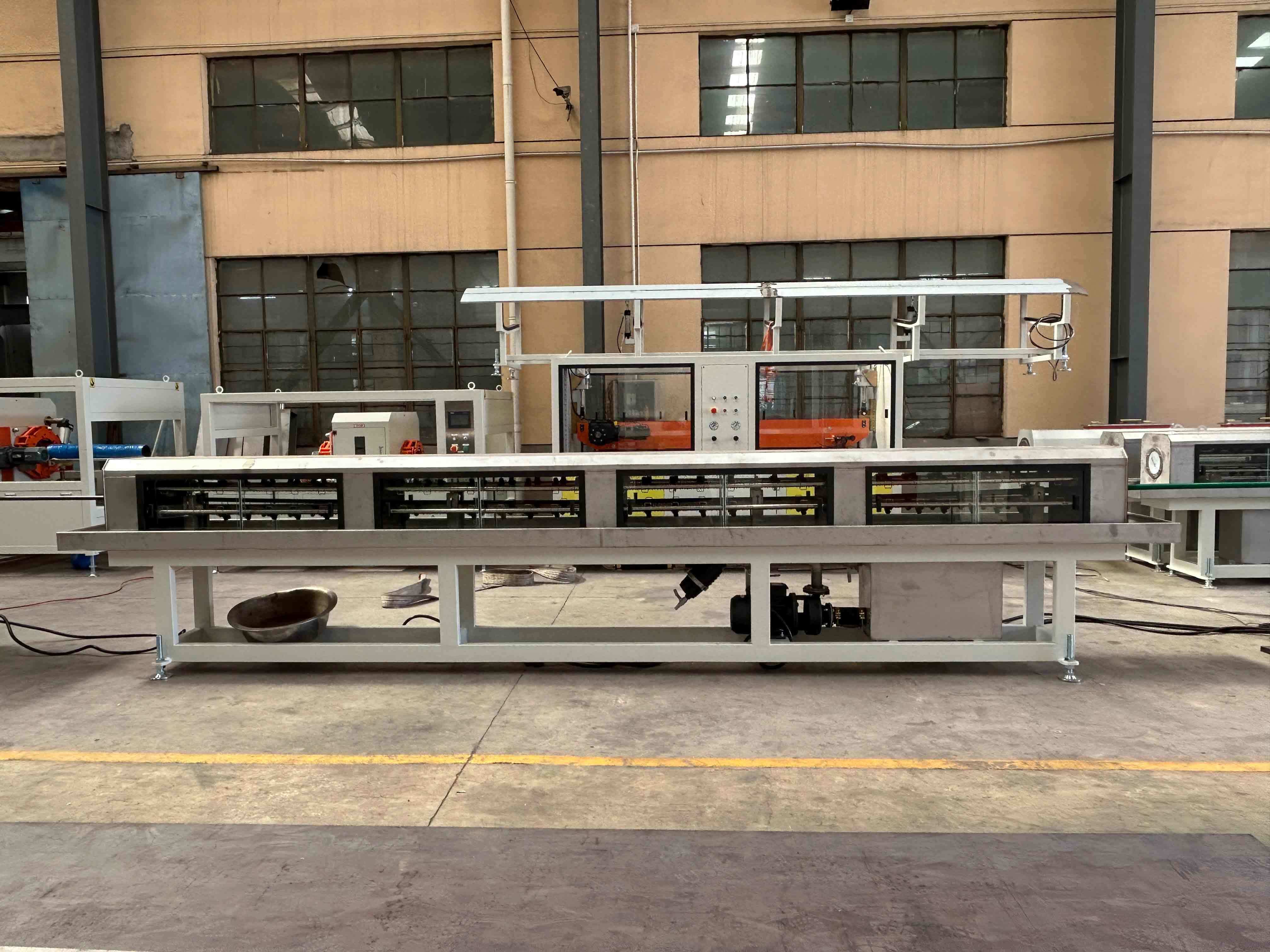 Plastik cair melewati kepala cetakan untuk membentuk pipa/profil, kemudian masuk ke tangki kalibrasi vakum untuk ukuran dan pendinginan yang presisi.