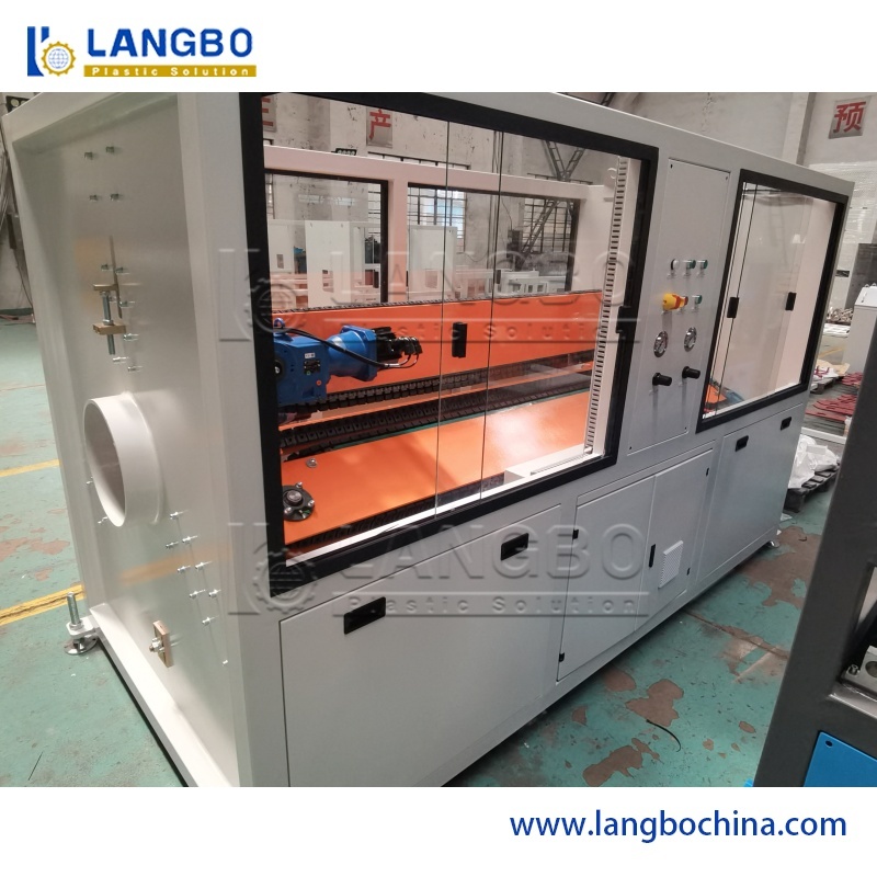 Bahan baku + aditif → Pencampuran → Pengangkutan material → Pemberian makan paksa → Ekstruder sekrup kembar kerucut → Cetakan ekstrusi → Unit kontrol diameter → Kotak pembentuk vakum penyemprot → Tangki air pendingin tipe semprot/rendam → Mesin penanda → Traktor jalur perayap → Pemotong → Mesin pelebar pipa → Penumpuk pipa → Inspeksi & pengemasan pipa